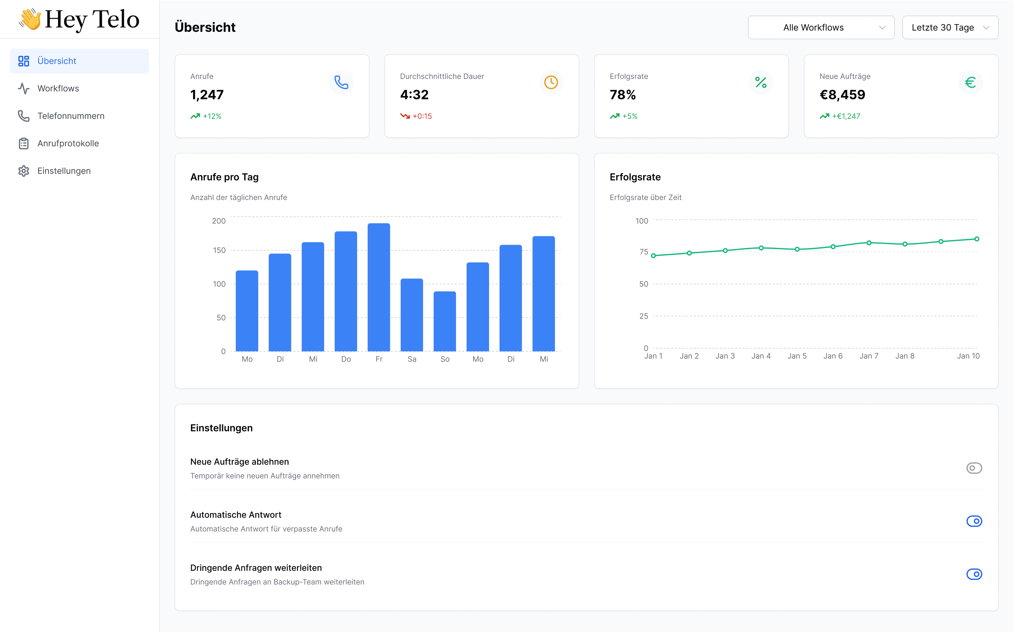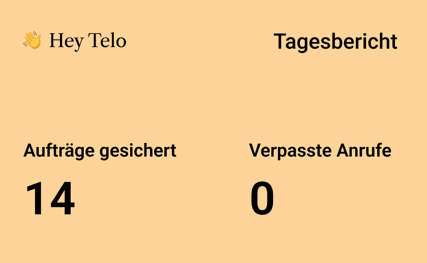 Hey Telo nimmt jeden Anruf an, wann immer Ihre Rufumleitung aktiv ist. Alle Infos landen sauber im System – so kann sich Ihr Team auf Wertarbeit konzentrieren, statt auf Rückruf-Marathons.